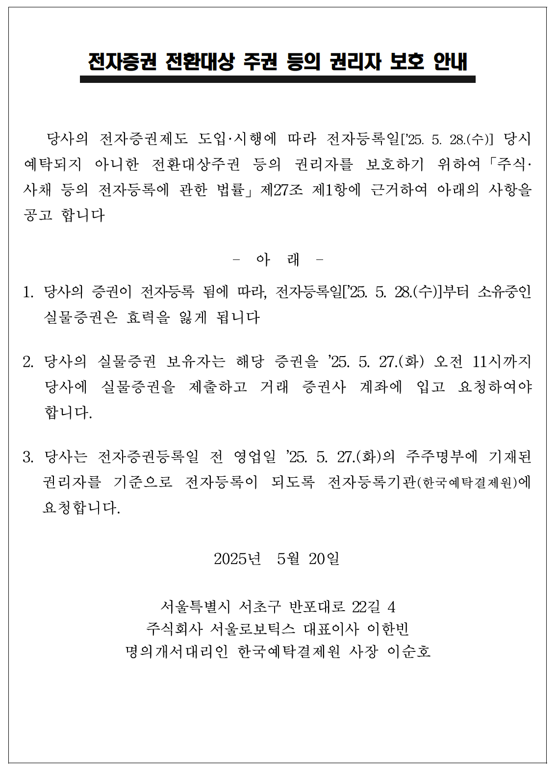 당사는 기존 ‘25.5.21에서 ‘25.5.28로 전자증권 전환일을 연기하게 되었음을 알려드립니다. 너른 양해의 말씀 구합니다.